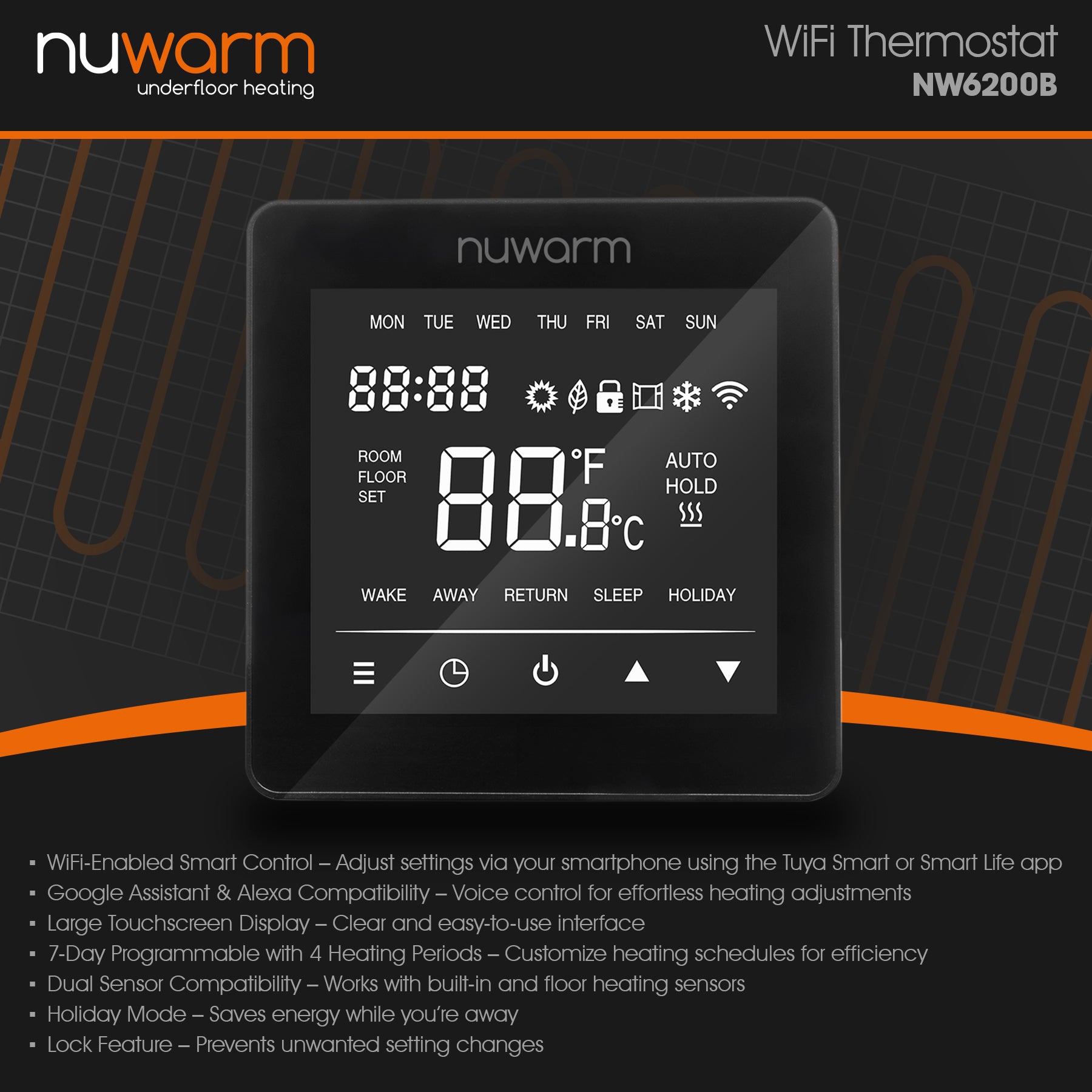 The Nuwarm T6200 WiFi Thermostat is the best thermostat for electric underfloor heating, providing both remote and voice-controlled heating management. Whether you're looking for an energy-efficient floor heating thermostat or a fully programmable WiFi thermostat, this model offers ultimate flexibility and ease of use.